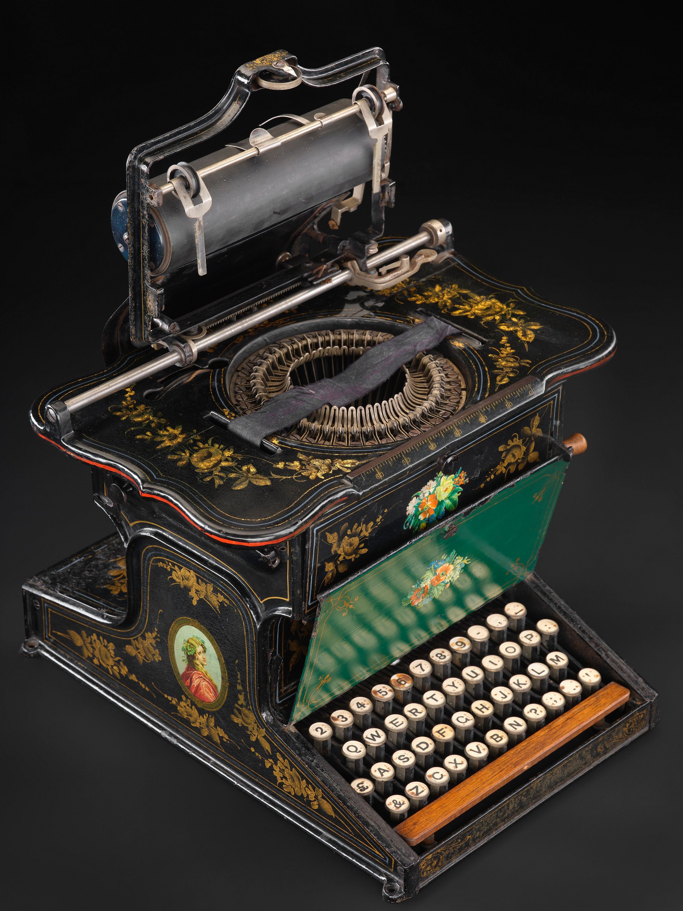 La Sholes & Glidden – ou Remington N°1 – est la première machine à écrire produite en série. Proposée à mille exemplaires en 1874, elle est l'ancêtre qui a donné son nom - typewriter - et la disposition des touches du clavier à toutes les machines à écrire produites dans son sillage. D'emblée, le public féminin est ciblé dans sa commercialisation. S'inspirant des machines à coudre que l'entreprise produit, la Sholes & Glidden est décorée de motifs floraux. De jeunes femmes apparaissent sur les visuels publicitaires et sont employées pour démontrer son fonctionnement.